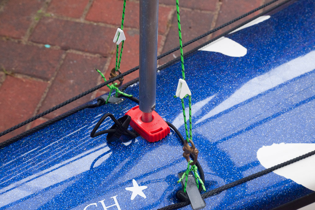 When folded and stowed on deck, the rig is secured by a short length of shock cord tied to the rear of the deck lines and secured by a plastic olive cleat…