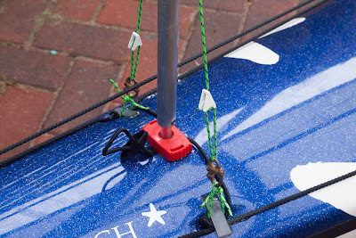 I mounted the pulley for the uphaul/fore stay on the front deck line recessed deck fitting (RDF). The pulley for the sheet and the back stay went on the front deck elastic RDF. The existing side deck line RDFs were just too far behind the mast to provide support when reaching or beating so I mounted two stainless steel saddles on either side of the mast and attached the side stays to them. If you were only interested in downwind sailing you could use the RDFs and do away with the back stay.